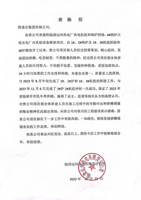 臨清運(yùn)河熱電2#機(jī)組沖轉(zhuǎn)一次成功表?yè)P(yáng)信