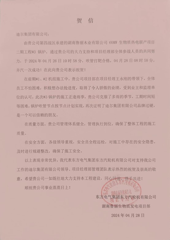 湖南魯麗木業(yè)有限公司60MW生物質(zhì)熱電聯(lián)產(chǎn)項(xiàng)目二期工程3#鍋爐于2024年4月26日10時(shí)58分吹管打靶合格,4月28日08時(shí)58分并汽一次成功??偘綎|方電氣集團(tuán)東方汽輪機(jī)有限公司給項(xiàng)目部發(fā)來了賀信。