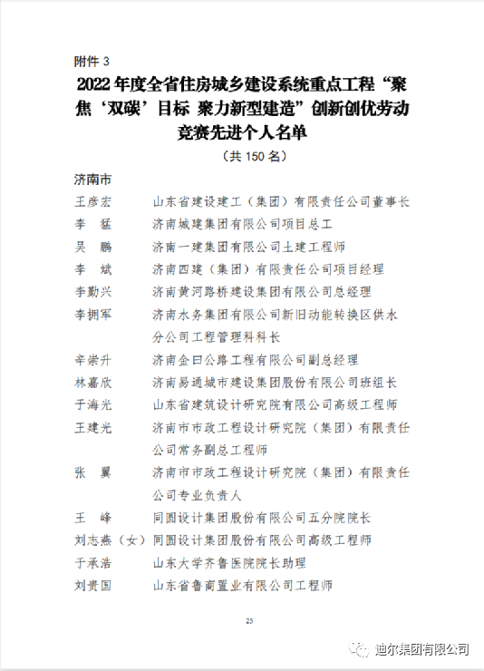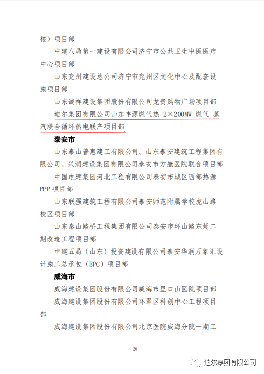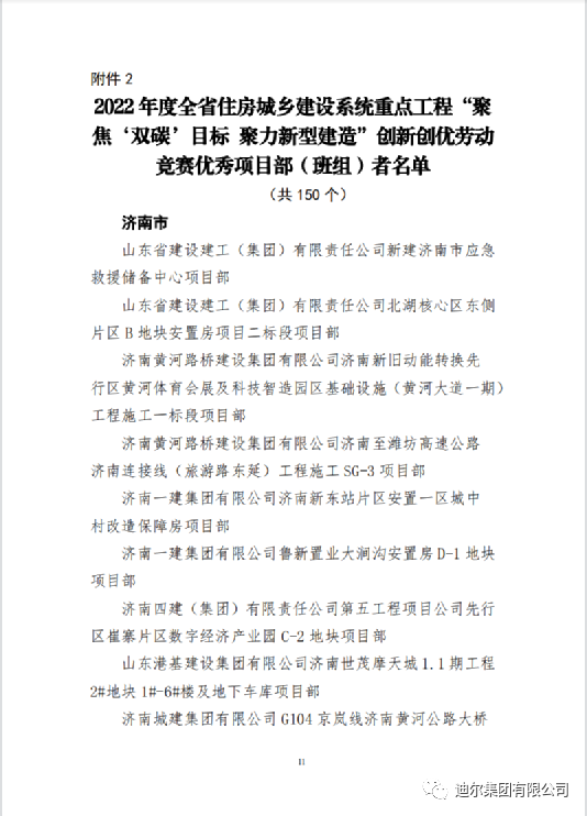 2022年12月28日,山東省住房和城鄉(xiāng)建設廳、中共山東省委省直機關工作委員會、山東省總工會聯(lián)合發(fā)布文件,迪爾集團有限公司在 2022年度全省住房城鄉(xiāng)建設系統(tǒng)重點工程“聚焦‘雙碳’目標 聚力新型建造”創(chuàng)新創(chuàng)優(yōu)勞動競賽中獲評“先進集體”榮譽稱號;迪爾集團山東豐源燃氣熱 2×200MW 燃氣-蒸汽聯(lián)合循環(huán)熱電聯(lián)產項目部獲評“優(yōu)秀項目部(班組)”榮譽稱號;公司員工趙建坡獲評“先進個人”榮譽稱號。