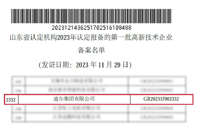 近日,根據(jù)國家高新技術(shù)企業(yè)認定管理工作網(wǎng)發(fā)布的《對山東省認定機構(gòu)2023年認定報備的第一批高新技術(shù)企業(yè)進行備案的公告》通知,迪爾集團有限公司再次順利通過換證評審,獲得“國家高新技術(shù)企業(yè)”認定。